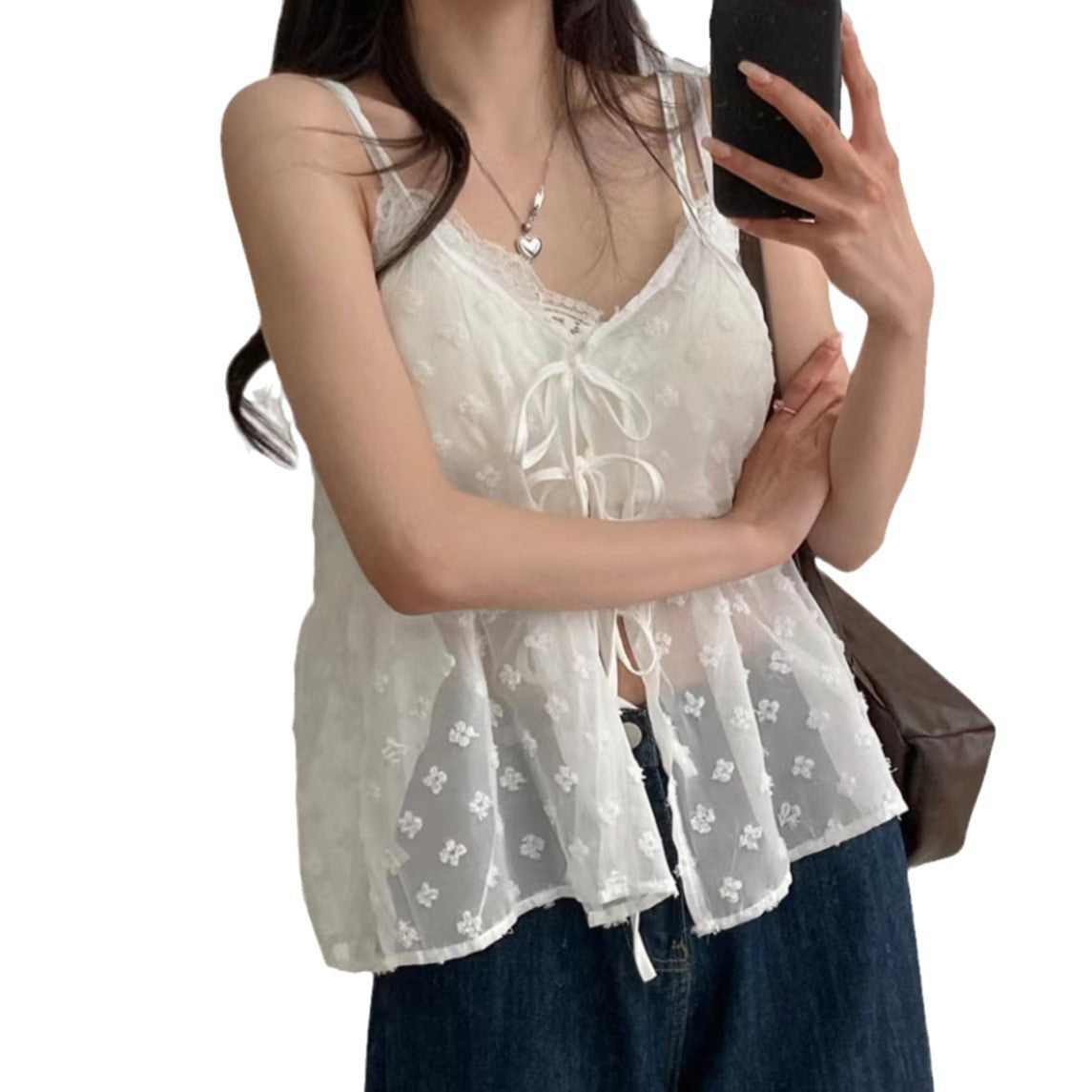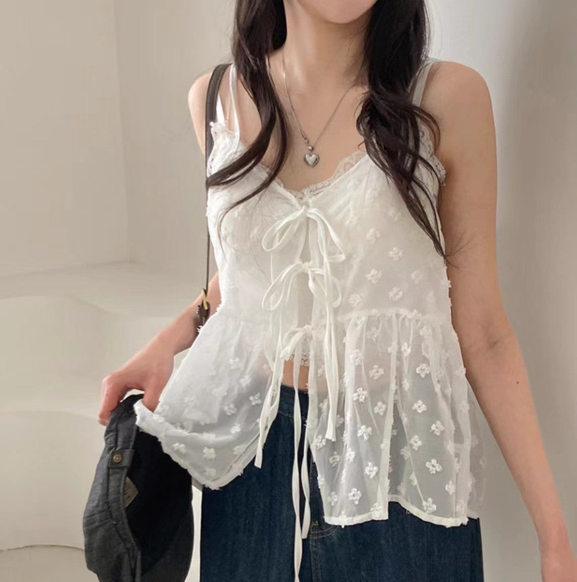 Details: • Color options: White, Black • Style: Jacquard embroidery, lace-up V-neck • Fit: Free size • Type: Casual Korean-inspired